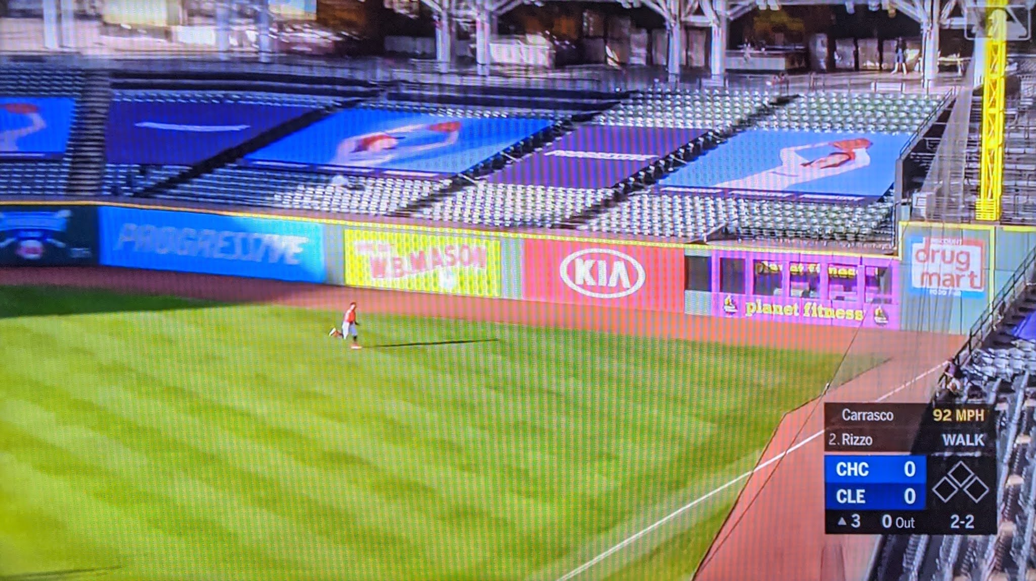 Even in normal times, the backstop in Cleveland is designed such that you don’t really see fans from the primary center field camera, so not much has changed there. But other camera angles show that the club placed a few scattered cutouts in the stands. It looks like the outfield has a takeover campaign from Progressive Insurance, the naming sponsor for the ballpark, featuring cartoon illustrations of the company mascot, Flo, trying to catch fly balls. Sure!