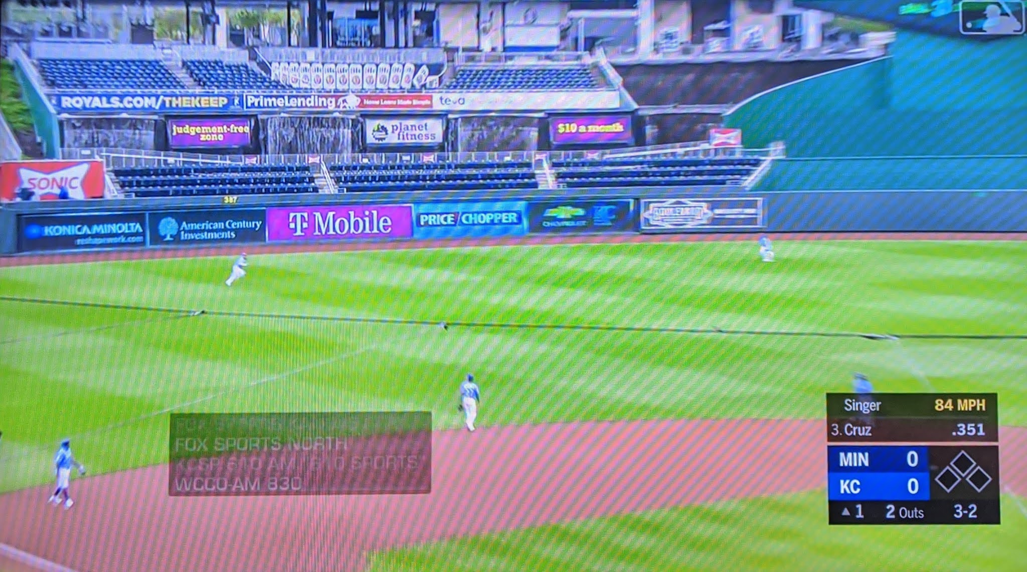 Clearly, someone with the Angels decided that if outside entities weren’t going to pay for ad space in their empty seats, the team would take advantage themselves. There’s very little going on behind home plate, but if there’s a fly ball to right, you see a couple ads, a public service piece, and multiple giant tarps with the Angels’ logo, both in fair and foul territory. We get it, guys: the Angels are at home. We know it’s the Angels game because we chose to watch it.